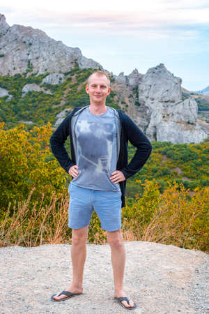 Selfie-portrait of a young male tourist against the background of mountains. The concept of tourism, shared recreation