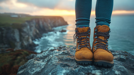 Man's boots and legs with the coast in the background. Concept of exploration and adventures