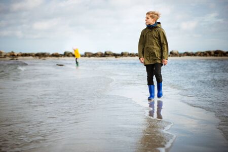 Two happy children walking in water at the beach of Baltic sea in rubber boots at windy and cold weather