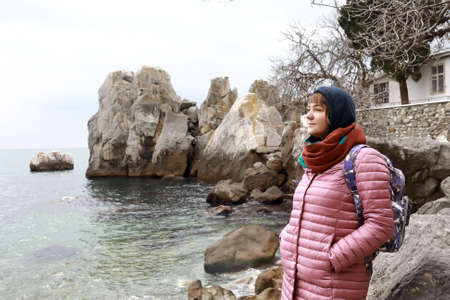 Woman tourist with a backpack looking into the distance at sea on the picturesque coast of Cape Tobizin on the Russian island in Vladivostok on a sunny spring day.