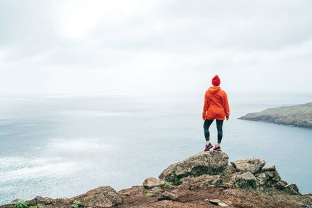 Trail runner female dressed orange sporty hoodie and red cap resting on the cliff and enjoying Atlantic ocean view on Ponta de Sao Lourenço peninsula -the easternmost point of Madeira island, Portugal