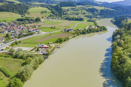 An aerial shot of the Drava river on a sunny day in Slovenia