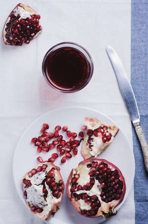 sliced pomegranate on a linen tablecloth, tree