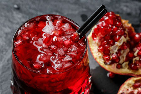 A close-up picture of a benefit pomegranate juice with cubes of ice on a black background. The freshly squeezed garnet juice and red garnet berries on the desk. The glass of beverage with straw.