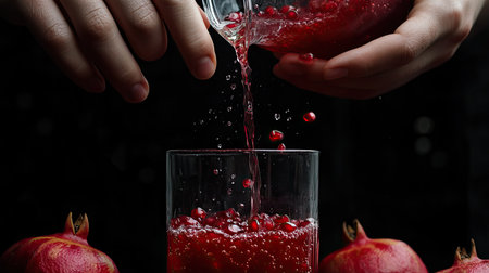 A stunning close-up of vibrant red pomegranate juice being poured into a clear glass, showcasing fresh seeds and bubbles against a dark backdrop.
