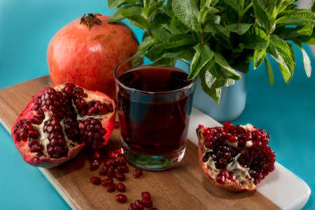 Pomegranates and a glass of pomegranate juice with a sprig of mint on a chopping Board.