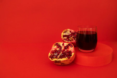 Glass of pomegranate juice on a podium with a pomegranate divided into pieces. Red bright background. close up. Place for text. Healthy lifestyle concept.