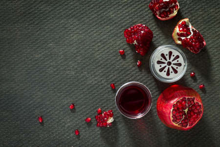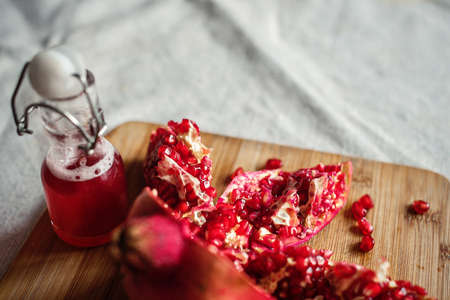 Ripe red pomegranate. Ripe grains of pomegranate on the table. Pomegranate juice.