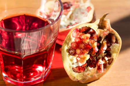 Red pomegranate and juice in a class on a light table