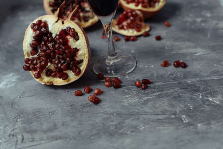 A glass of wine on a gray background among pomegranates. Close pomegranate and red pomegranate seeds. The leg of a glass goblet next to the fruit.