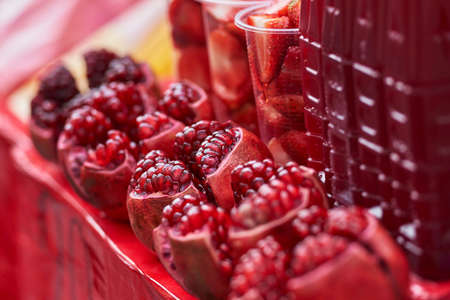 Red fresh ripe appetizer pomegranate seeds close-up