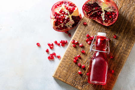 Pomegranate vinegar and fresh pomegranate on a light background. Selective focus, place for text.