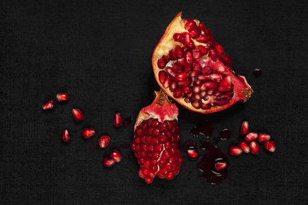 Still life. Juicy ripe opened pomegranate fruit with seeds close up