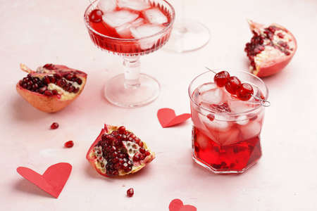 glasses with fresh pomegranate juice with one real pomegranate on concrete tray on pink background with red hearts decoration