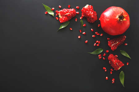 Luxurious pomegranate background. Pomegranate core on black background, top view. Healthy fruit eating.
