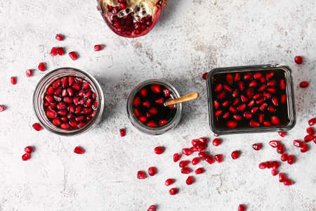 Jars and bowl of pomegranate molasses on light background