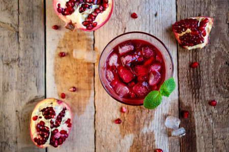 Pomegranate Cocktail with Ice Mint and Fruit on Wooden Table. Re