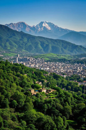 The city at the foot of the mountain and the lush mountain landscape