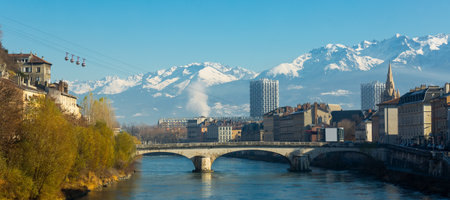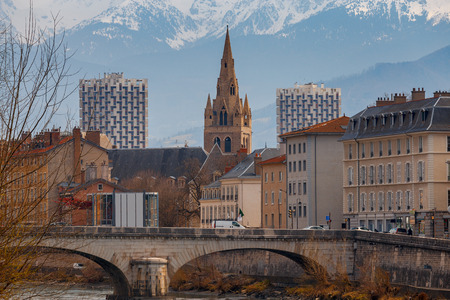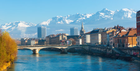 Morning cityscape view with mountains, river and bridge in Grenoble city on the south-east of France