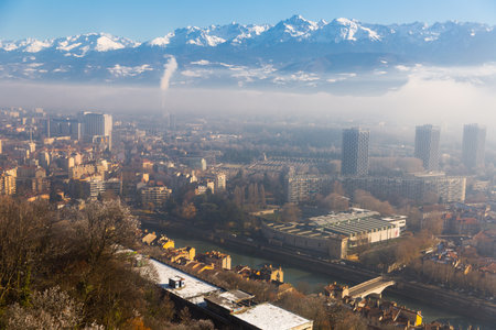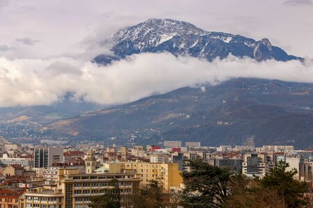 stunning winter view of Grenoble town with snow mountains on the background