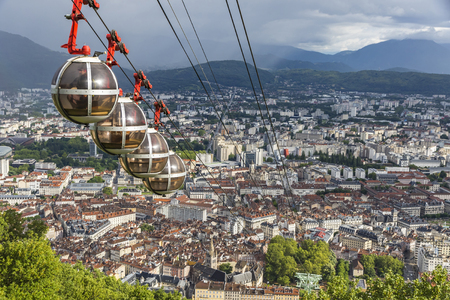 GRENOBLE, FRANCE - APRIL 13 : Grenoble-Bastille cable car, four bubbles on sling, transport to hill and fortress of Bastille cross Isere river in Grenoble, France, was taken on April 13, 2017.