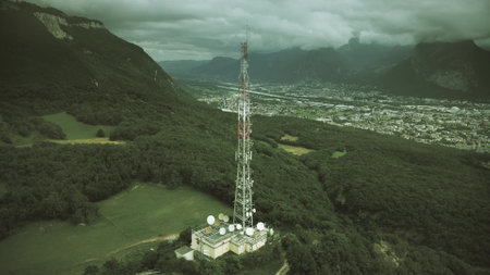 Aerial shot of a big telecommunication tower with antennas in the Alps with Grenoble cityscape as a background, France