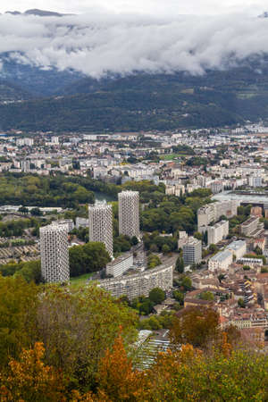 Grenoble, France - October 1, 2023: Scenic aerial view of Grenoble city, Auvergne-Rhone-Alpes region, France. Grenoble-Bastille gondola in the foreground.