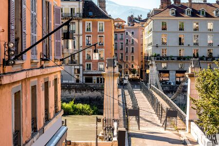 GRENOBLE, FRANCE - APRIL 13 : Old classic buildings view from bridge cross Isere river in Grenoble city in France, under blue sky with slings of cable car, on April 13, 2017.