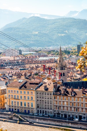 Grenoble, France - June 21, 2016: Morning cityscape view on the old town with cable car and mountains in Grenoble city on the south-east of France