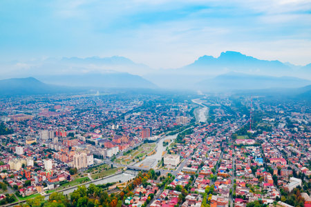 Vladikavkaz aerial panoramic view. Vladikavkaz is the capital city of the Republic of North Ossetia-Alania in Russia.