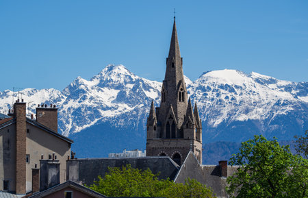 View of Grenoble with gothic spire of Saint-Andre Church against backdrop of snowy Alps in sunny day, France