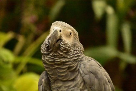 Gray parrot, in Latin called psirttacus erithacus, sitting in the tree crown sleeping. He is crouched, the beak hidden under one of his wings.