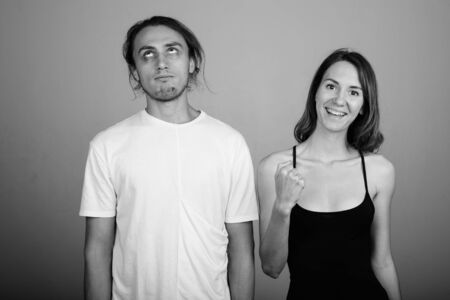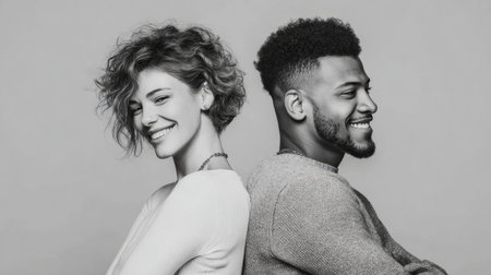 Couple enjoys a fun moment standing back to back with smiles, showcasing their playful relationship against a simple background.