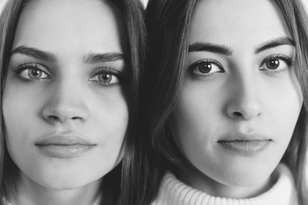Close up portrait of beautiful brunette women on studio background, black and white. Home comfort, emotions, facial expression, winter mood concept. Friendship. Well-kept skin, natural make up.