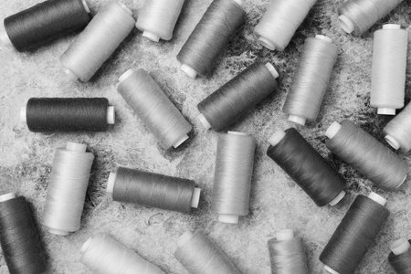 Sewing threads on bobbins. On a black and white background. Place for text.