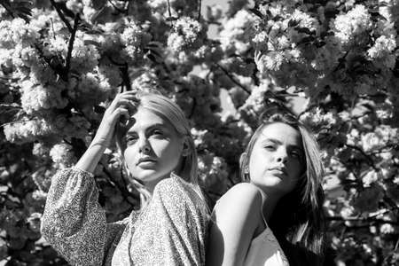 Spring girls fashion. Beautiful girl in pink flowers in summer blossom park.