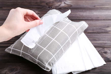 Hand reaching for a tissue from a wooden napkin box on a table, emphasizing a clean and hygienic setting.