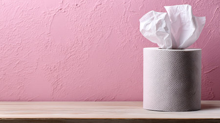 A tissue dispenser sits on a wooden surface with a textured pink wall.