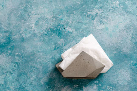 concrete napkin holder with white paper napkins on hand painted aqua background.