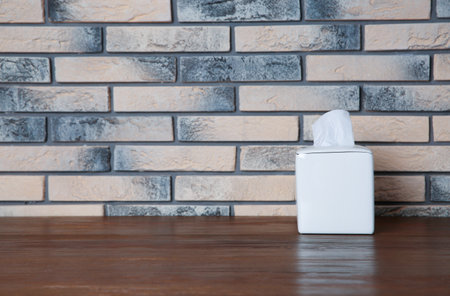 Napkin holder with paper serviettes on table against brick wall. Space for text
