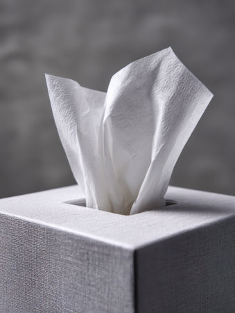 A chic white tissue container with delicate paper tissues gently extending, set against a subtle, unfocused backdrop that evokes calmness and daily comfort.
