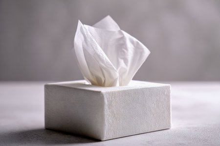 A beautiful close-up of a white tissue box, featuring soft tissue paper delicately arranged, set in a serene indoor environment with natural light highlighting its elegance.