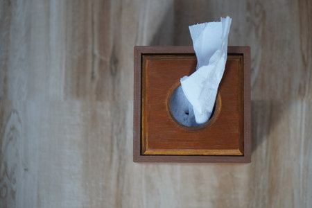 Tissue box rests on a wooden table, subtly illuminated by soft light in a warm indoor environment, creating a comforting ambiance.