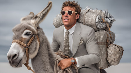 Portrait of a handsome young man in a suit and sunglasses with a donkey.