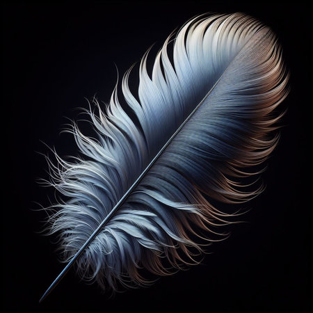 This stunning close-up of a delicate feather captures intricate details and reflections of soft light, showcasing nature's beauty and elegance in a serene composition.