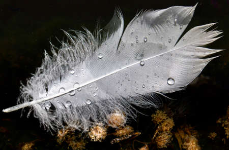 Wispy white swan feather with water droplets macro isolated on black . Copy space.