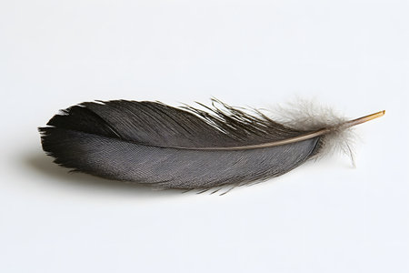 A detailed black feather resting on a white background. the delicate barbs and soft downy texture highlight the feather's natural beauty, making it ideal for design work and decorative projects. Generative AI