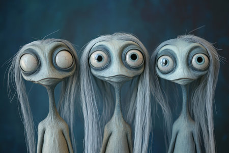 Three gray aliens with large eyes, they all have gray skin and long hair. They stand in line, looking at the camera. The background is dark blue. High-resolution photo. --ar 3:2 --v 6.1 Job ID: 333e5aaf-29df-4a94-92ac-291da3dd821b