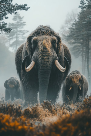 Mammoth family silhouetted in fog, low sun, mysterious landscape