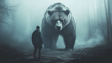 A breathtaking scene depicting a man standing before a colossal bear in a misty forest, evoking feelings of awe and respect for nature's power and beauty.